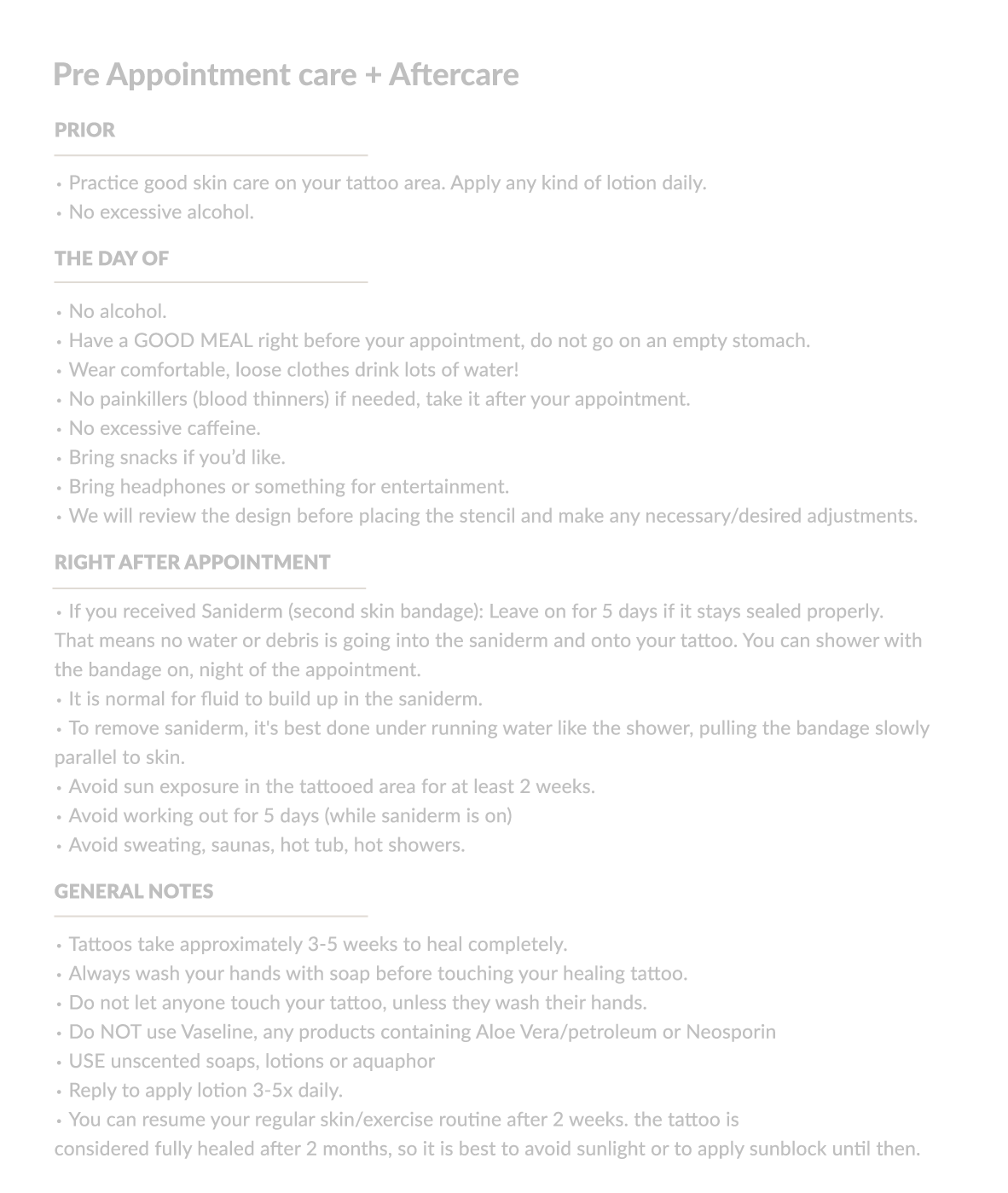 Bring snacks and any entertainment. I do my best work with minimal talking while I’m actively tattooing.